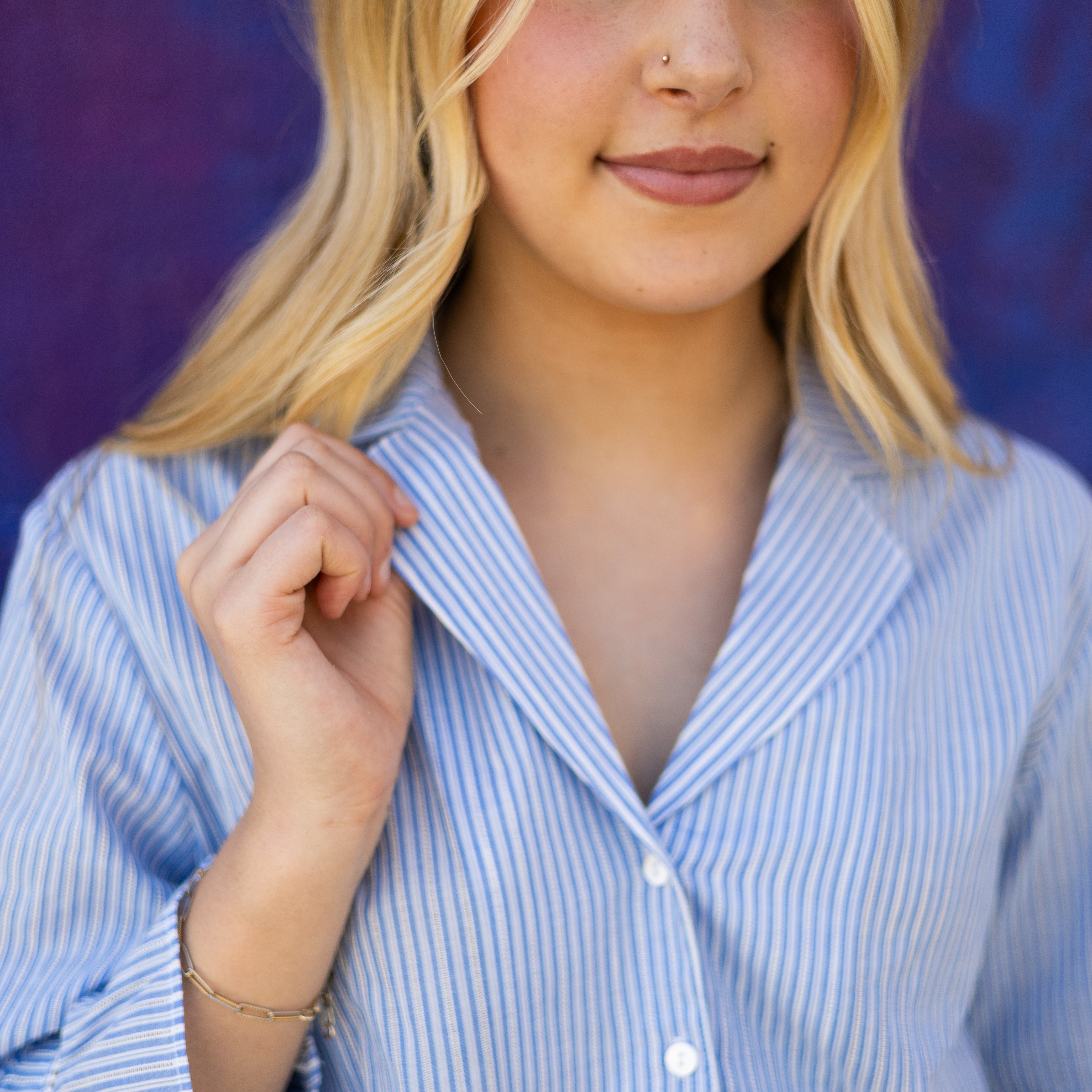 Drift into dreamland in style with our Dainty Daisy Top in soft blue and white stripes—a whimsical piece that captures the charm of a slow, sun-drenched morning. Inspired by the carefree beauty of a wildflower field, this button-up sleep shirt brings a romantic, vintage feel to your loungewear lineup while offering all the comfort you crave.