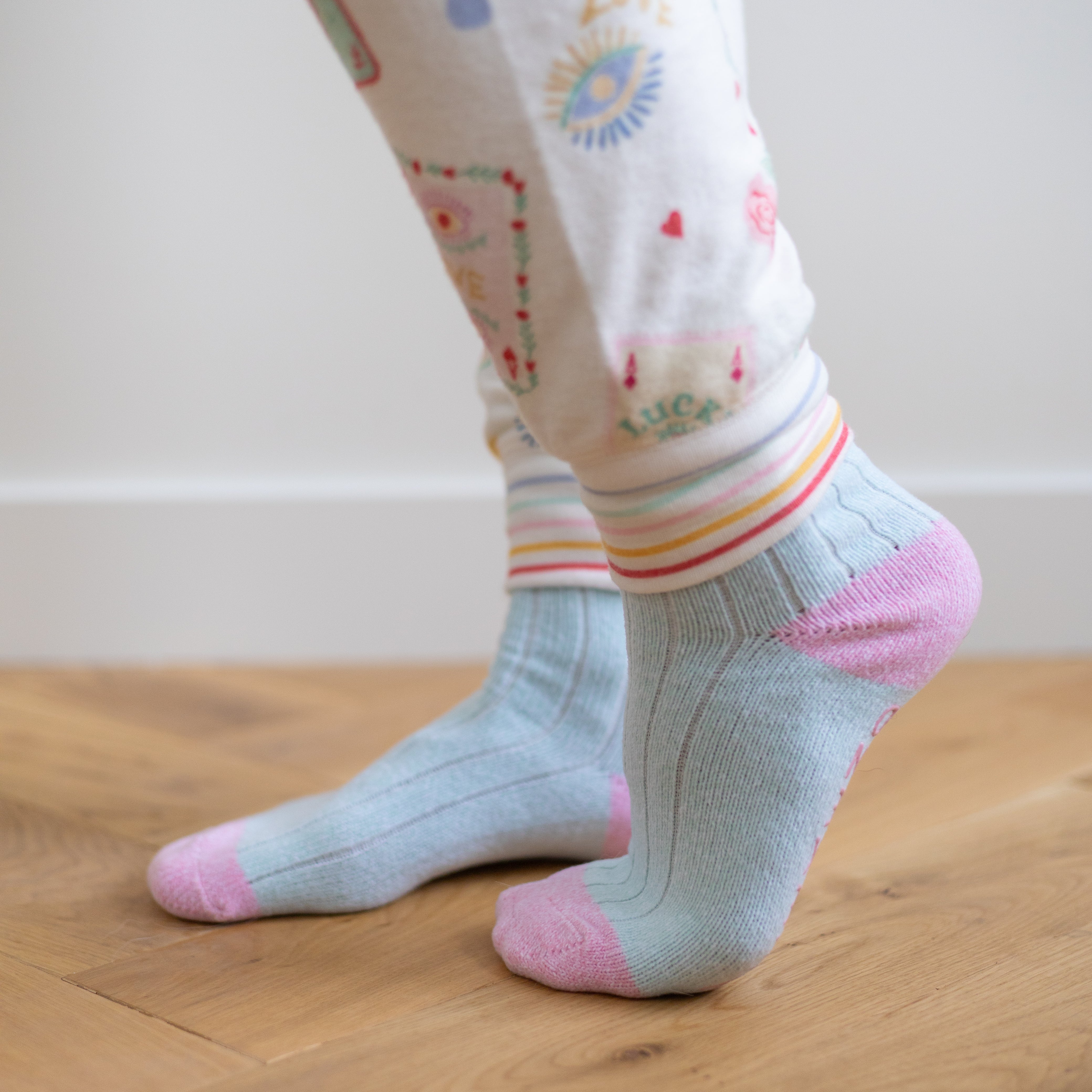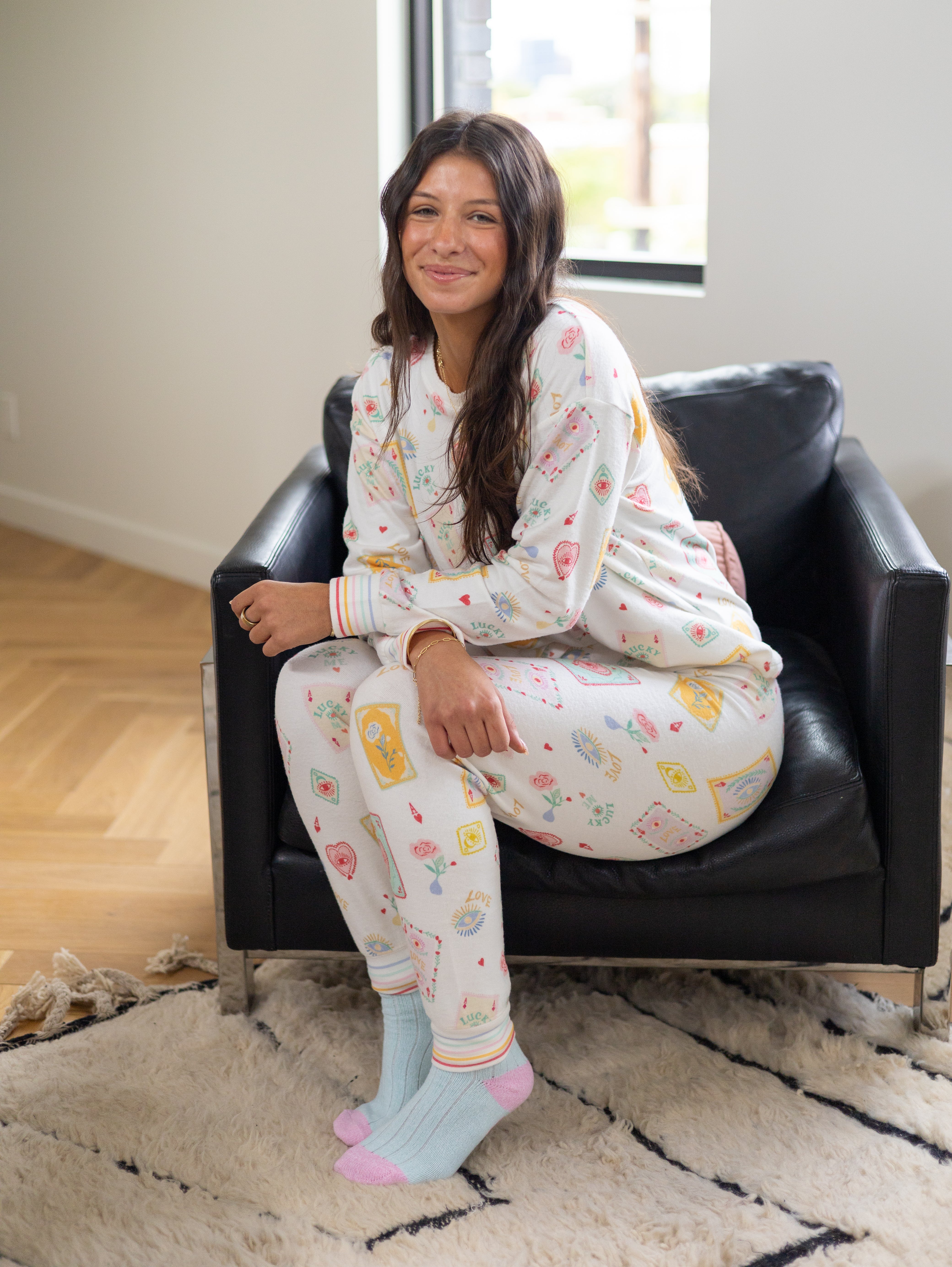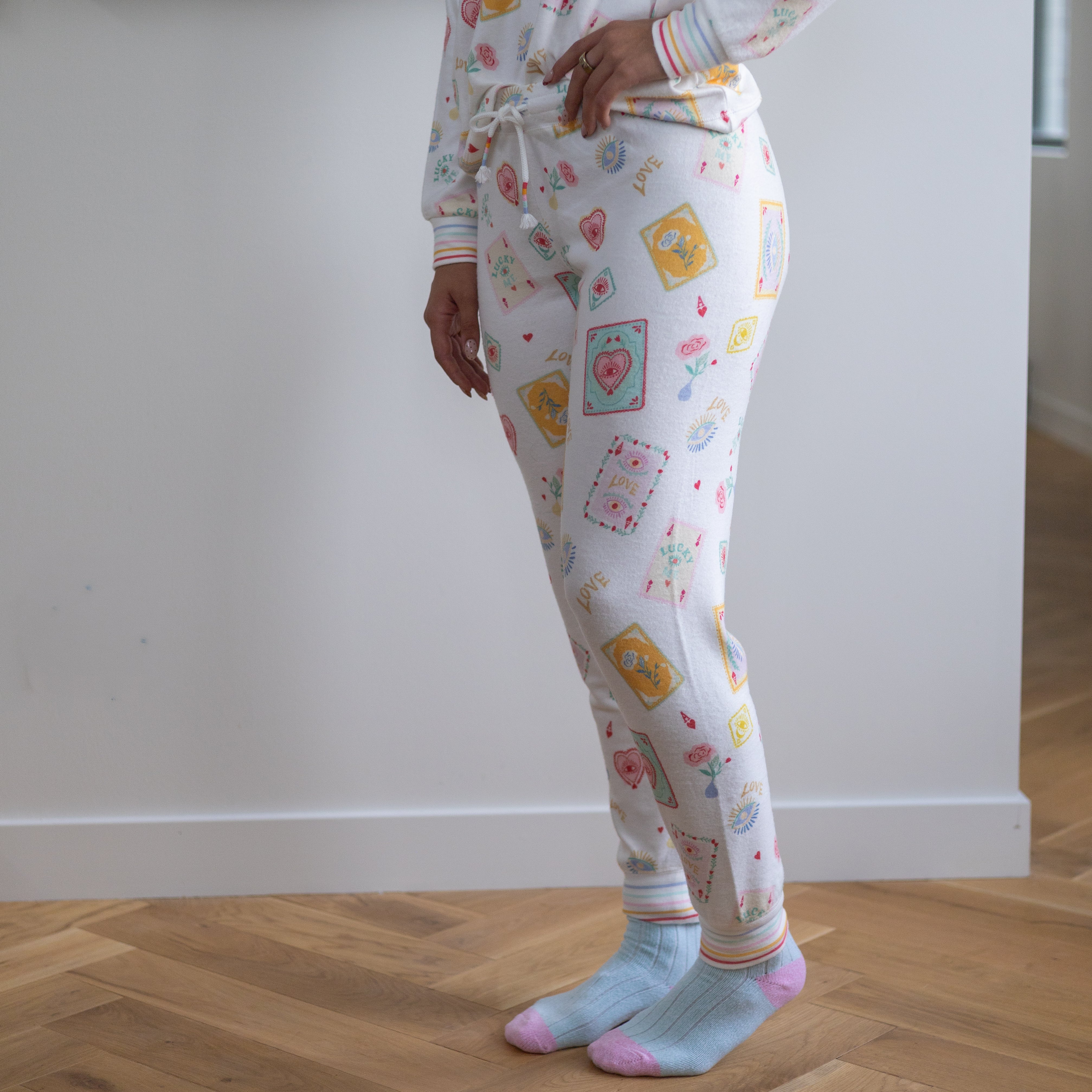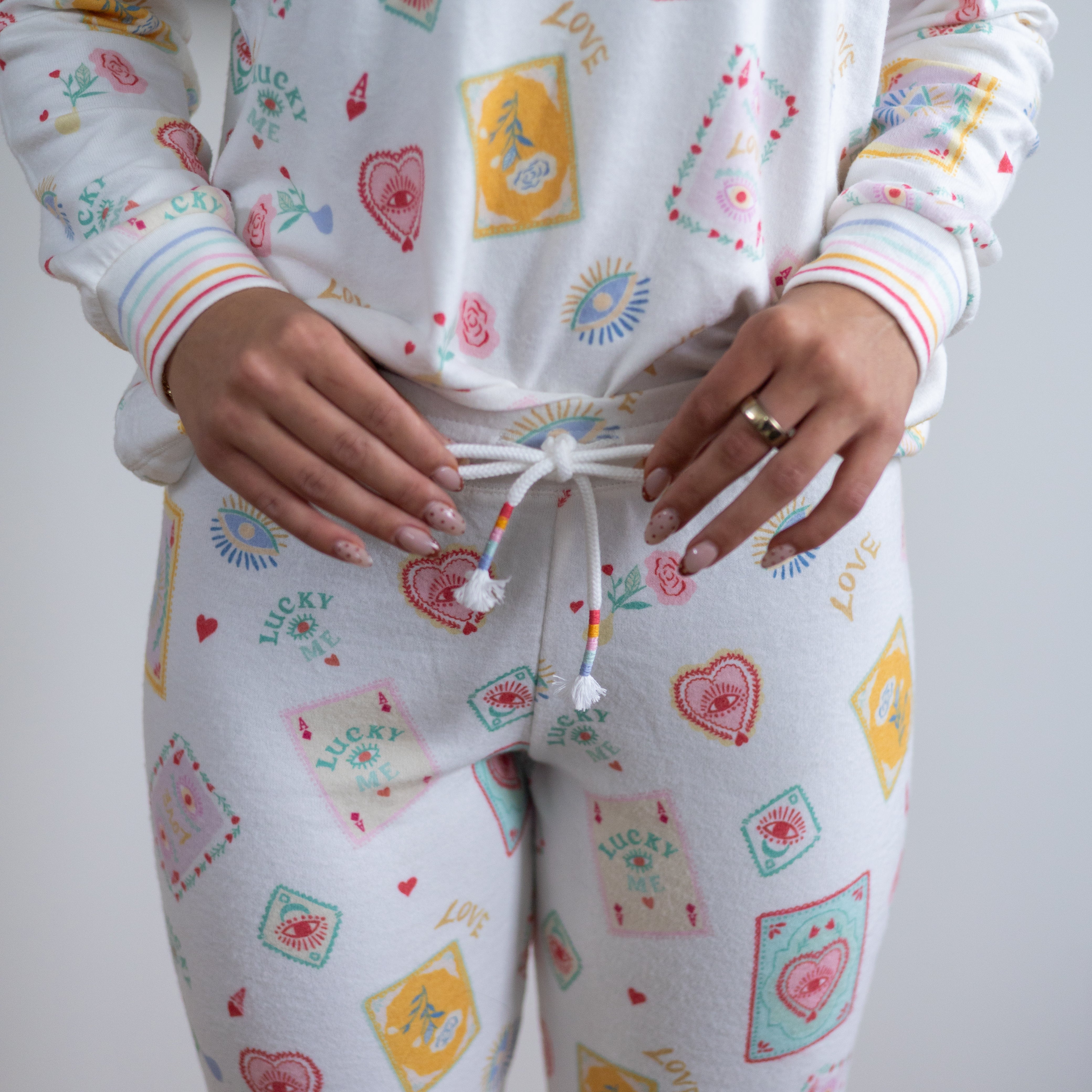 The ivory base is adorned with a charming allover print of whimsical playing cards, hearts, lucky eyes, and tiny good-luck charms, giving the pants a lighthearted, feel-good vibe. Every detail captures a sense of fun and fortune, making these the perfect companion for curling up with a good book, sipping your favorite tea, or sharing laughs over a late-night card game with friends.