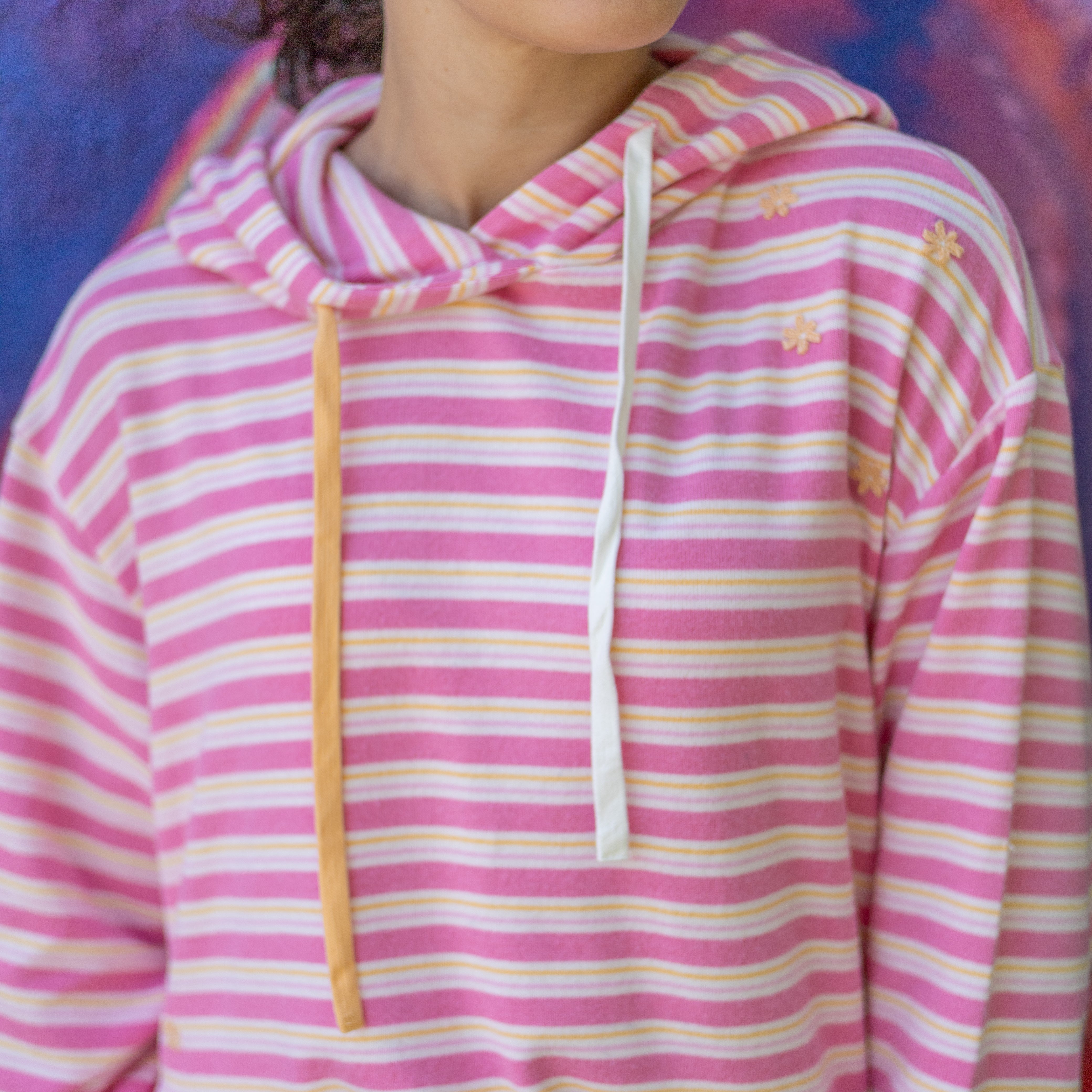 Bold sorbet stripes in cheerful pink and yellow give this pullover its standout personality, while a delicate floral embroidery detail blooms sweetly on the shoulder—adding just the right amount of feminine flair. Designed with a relaxed fit, it drapes naturally for easy layering, whether you’re pairing it with your favorite joggers or denim cutoffs.
