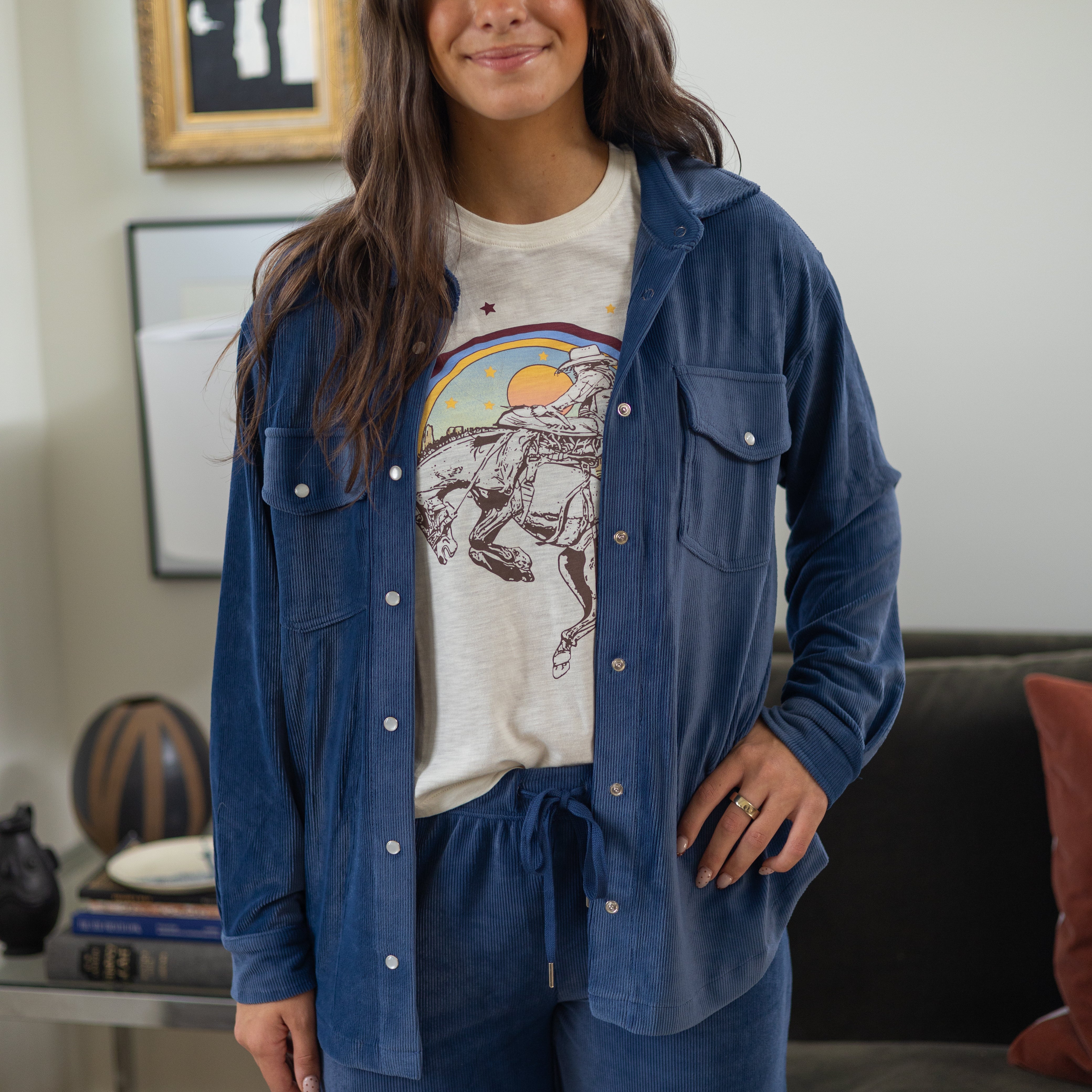 Pair it with the matching Craving Corduroy Pants for a coordinated look that’s both comfortable and chic, or mix it with your favorite jeans or leggings for a casual yet elevated outfit. The soft velour finish lends a luxurious touch, making it just as suitable for lounging at home as it is for relaxed weekends out.