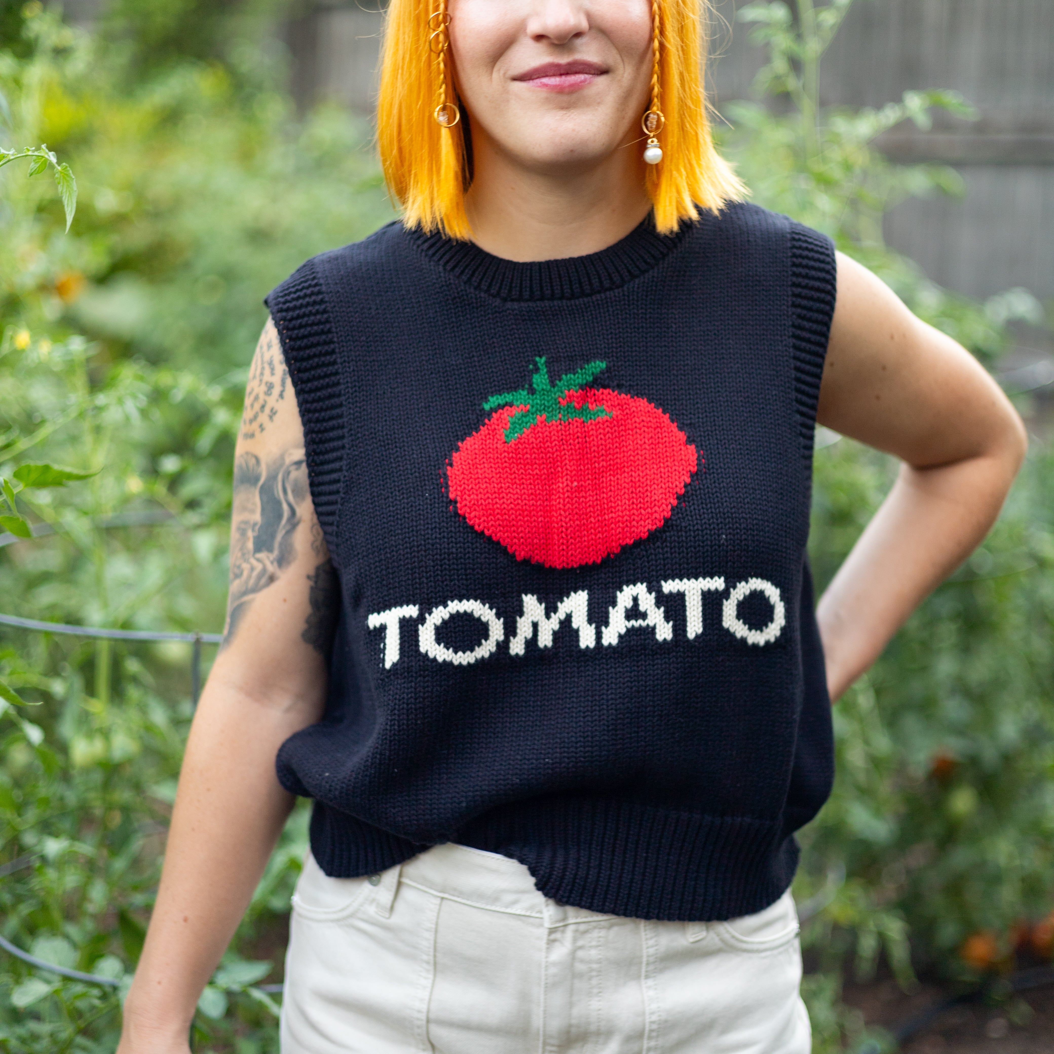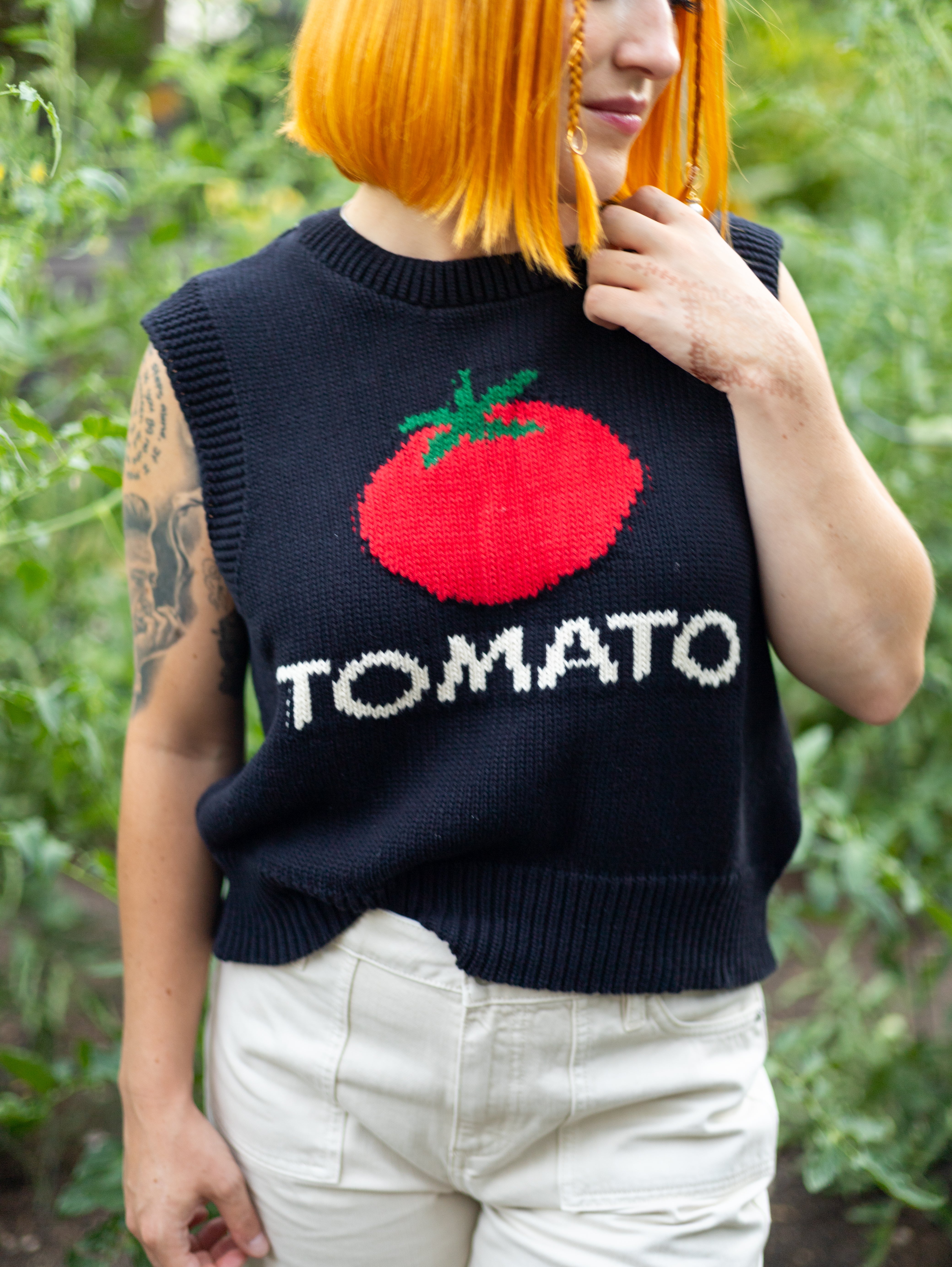 Inspired by a favorite borrowed-from-Mom sweatshirt, the Tomato Knit Vest brings nostalgic charm and playful personality to your wardrobe. Crafted from 100% organic cotton, this lightweight knit is soft, breathable, and perfect for layering throughout the seasons.